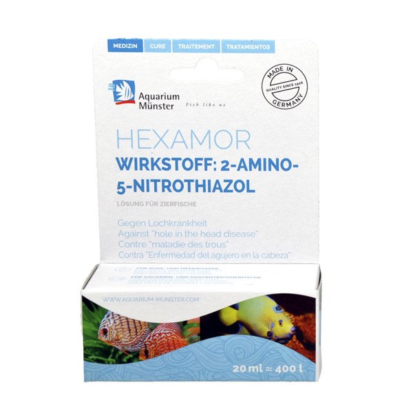 Aquarium Munster Hexamor 20ml est un médicament ultra efficace contre les flagellés des intestins : hexamita et spironucleus. C’est un médicament pour poissons d’agrément, que ce soit dans un aquarium d’eau douce ou alors un aquarium récifal. Le format 20ml permet de traiter 400 litres d’eau.