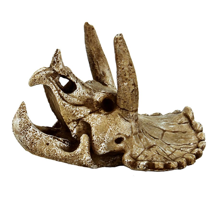 Crâne de Triceratops M – 15,7 x 12,8 x 11,5 cm est un décor en résine pour aquarium. Avec de belles finitions, ce décor permet de créer une ambiance préhistorique du temps des dinosaures. C’est une décoration amusante qui s’intègre aussi très bien autour de plantes naturelles, racines et roches. Il est aussi possible de placer des décorations artificielles Peut se placer dans tous les types d’aquariums d’eau douce.