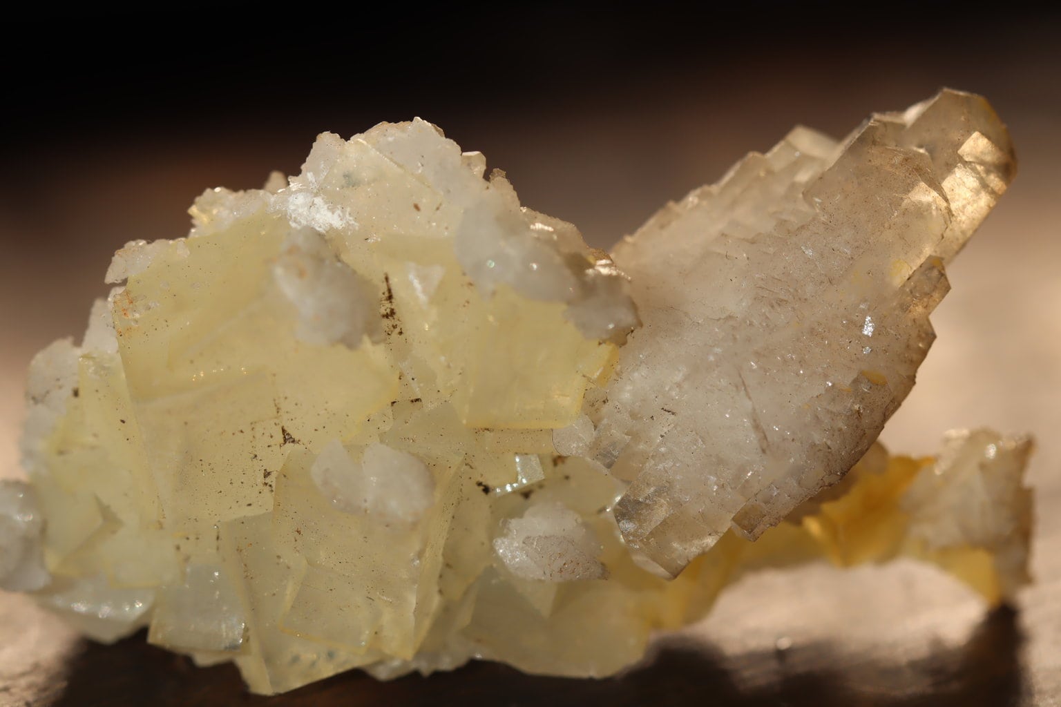Fluorite Fonsante n10 fait partie de ces minéraux commun mais particulièrement appréciés d’un bon nombre de collectionneurs pour ses formes variées et la beauté de ses couleurs. Elle peut être incolore, blanche, violette, bleue, jaune, marron, rose, rouge , noire! En France elle bénéficie encore de l’appellation fluorine. Certains amateurs ne collectionnent que cette espèce minérale et en ont fait leur thème fort. C’est un minéral omniprésent dans de nombreux et différents gites minéralogiques. D’une formule chimique CaF2, il apparait majoritairement dans les filons d’origines hydrothermaux de basse à haute température. Sa forme de base sera le cube pour les basses températures et l’octaèdre pour les hautes températures. Elle forme des cristaux polysynthétiques(trémies ou pyramides aztèques) et quelquefois sous forme sphérique. Dureté 4 et densité 3.1. Sa particularité est son éventail de couleurs qui couvre tout le spectre visible! Certaines même sont fortement fluorescents sous la lumière ultra violette!