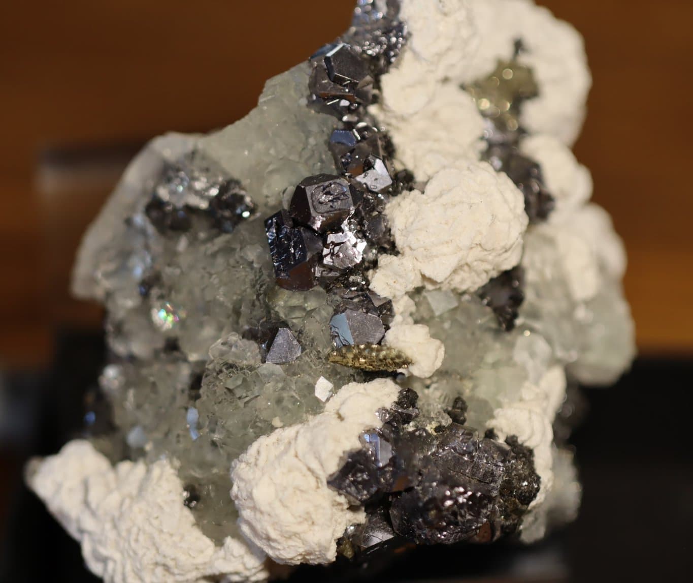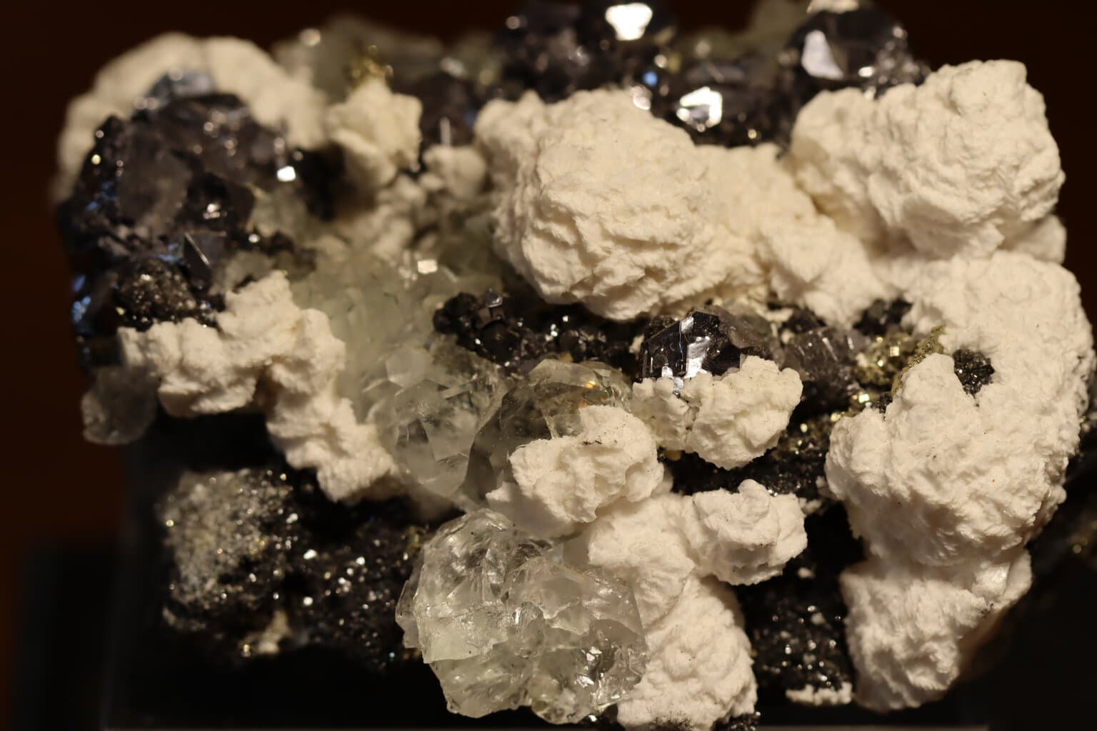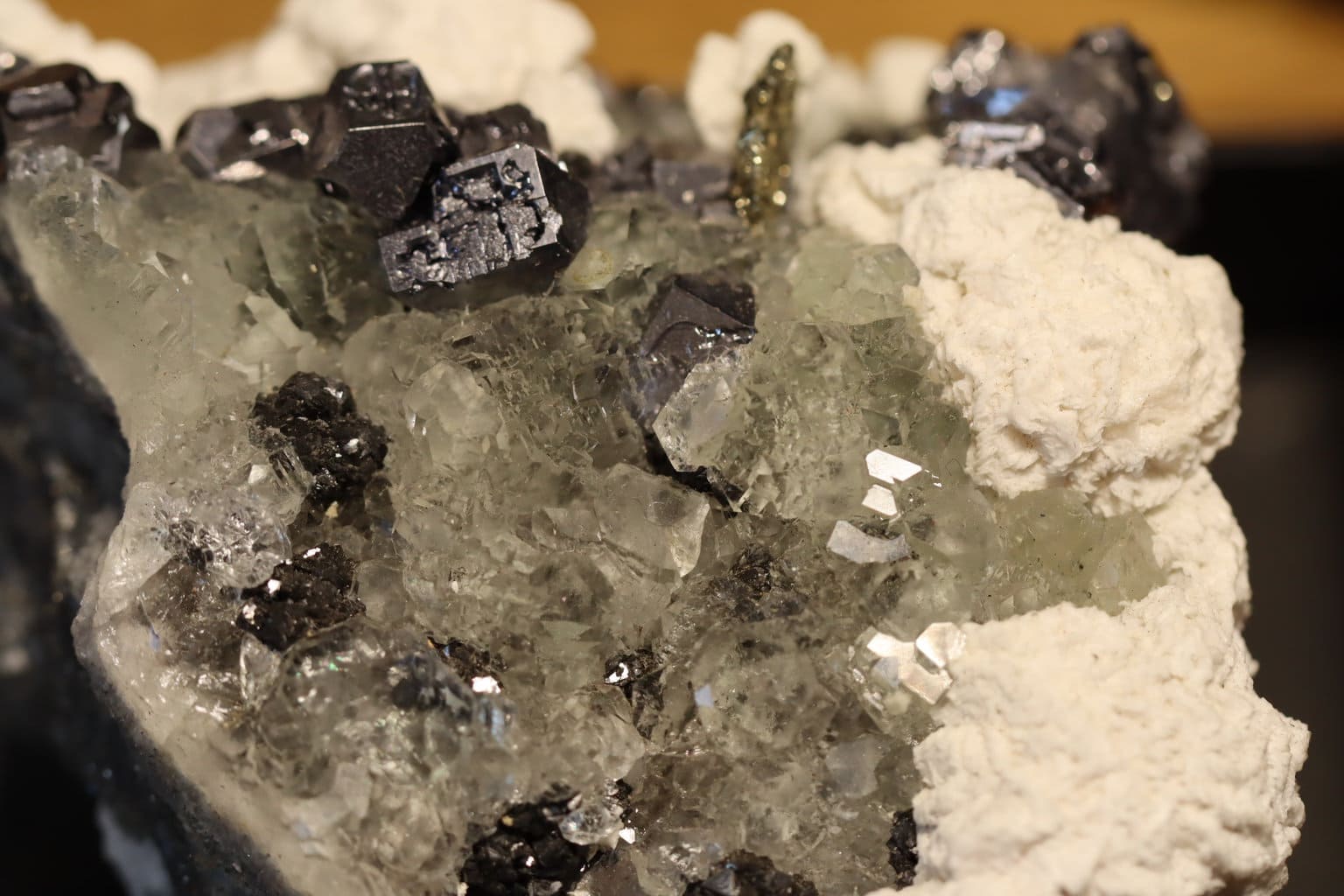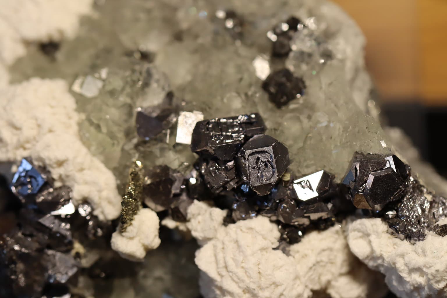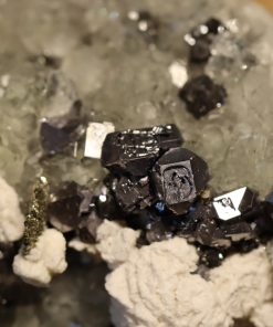 Fluorite galène dolomite fait partie de ces minéraux communs mais particulièrement appréciés d’un bon nombre de collectionneurs pour ses formes variées et la beauté de ses couleurs. Elle peut être incolore, blanche, violette, bleue, jaune, marron, rose, rouge, noire! En France elle bénéficie encore de l’appellation fluorine. Certains amateurs ne collectionnent que cette espèce minérale et en ont fait leur thème fort. C’est un minéral omniprésent dans de nombreux et différents gites minéralogiques. D’une formule chimique CaF2 il apparait majoritairement dans les filons d’origines hydrothermaux de basse à haute température. Sa forme de base sera le cube pour les basses températures et l’octaèdre pour les hautes températures. Elle forme des cristaux polysynthétiques(trémies ou pyramides aztèques) et quelquefois sous forme sphérique. Dureté 4 et densité 3.1 sa particularité est son éventail de couleurs qui couvre tout le spectre visible! Certaines même sont fortement fluorescentes sous la lumière ultra violette!