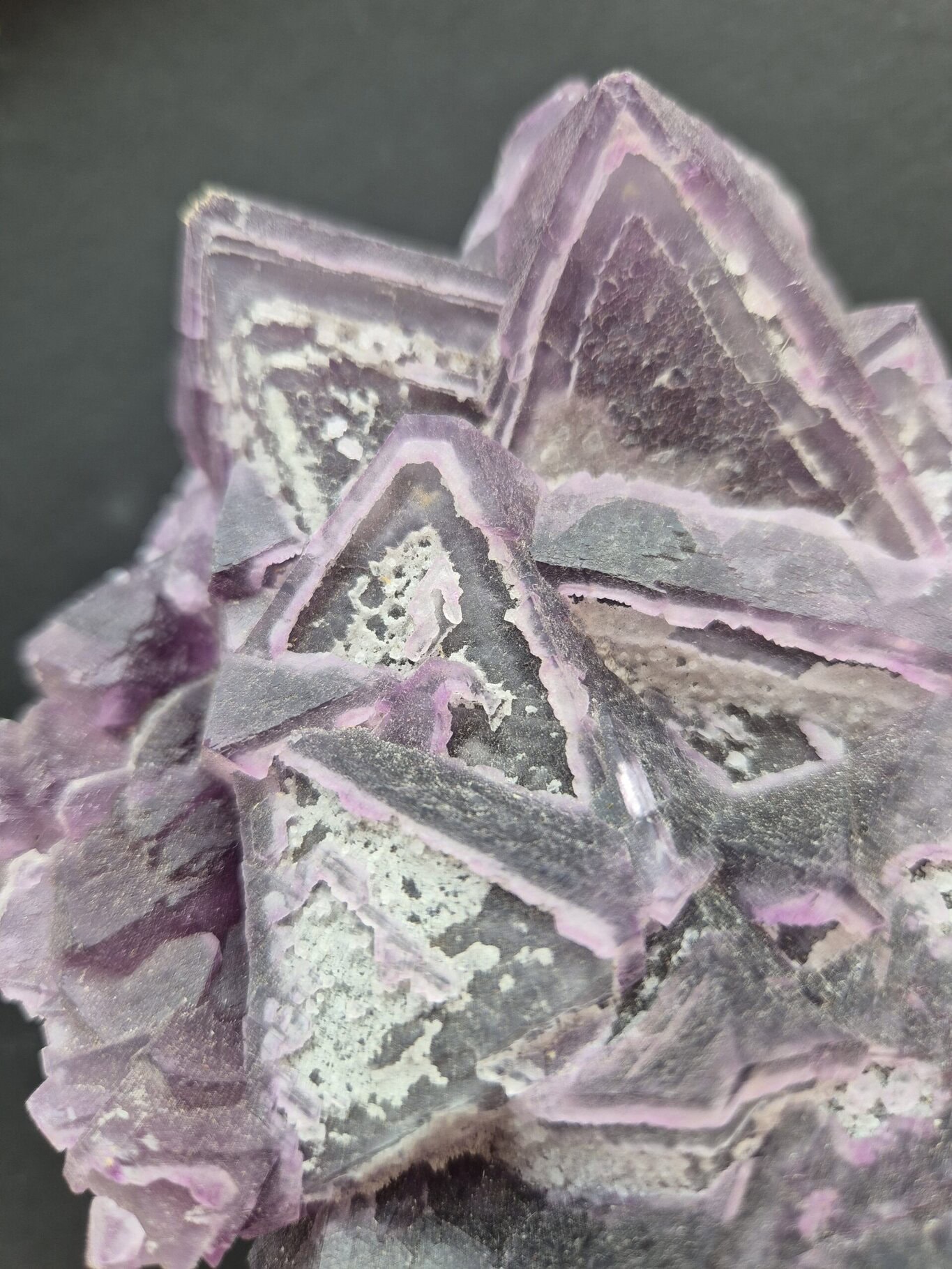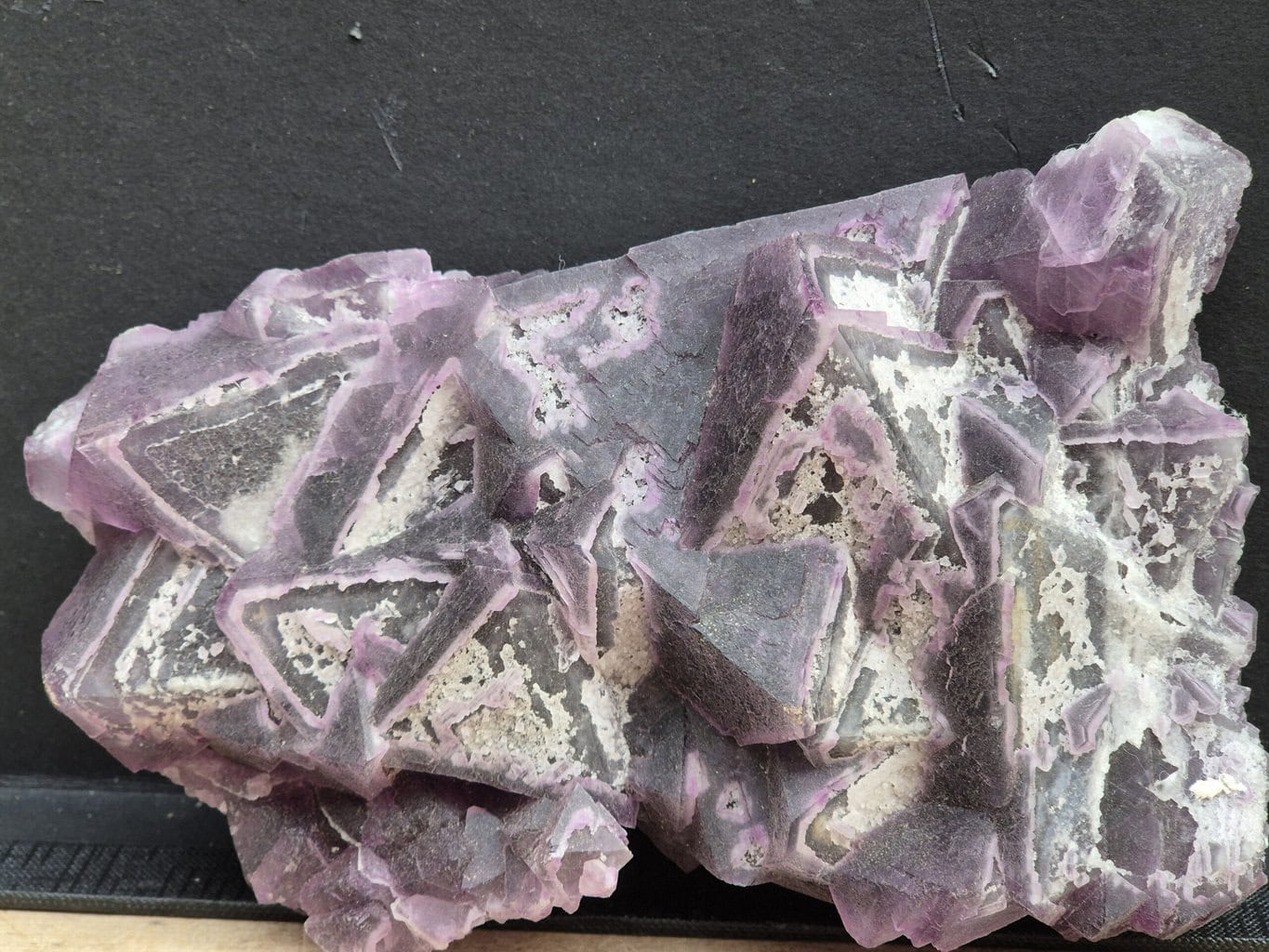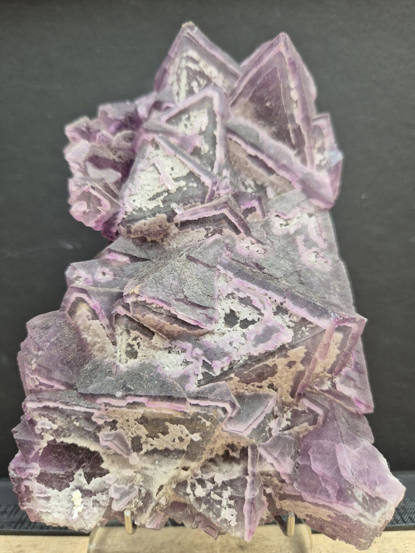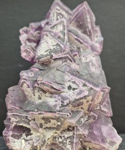 Fluorite octaèdrique violette fait partie de ces minéraux commun mais particulièrement appréciés d’un bon nombre de collectionneurs pour ses formes variées et la beauté de ses couleurs. Elle peut être incolore, blanche, violette, bleue, jaune, marron, rose, rouge , noire! En France elle bénéficie encore de l’appellation fluorine. Certains amateurs ne collectionnent que cette espèce minérale et en ont fait leur thème fort. C’est un minéral omniprésent dans de nombreux et différents gites minéralogiques. D’une formule chimique CaF2 il apparait majoritairement dans les filons d’origines hydrothermaux de basse à haute température. Sa forme de base sera le cube pour les basses températures et l’octaèdre pour les hautes températures. Elle forme des cristaux polysynthétiques(trémies ou pyramides aztèques) et quelquefois sous forme sphérique. Dureté 4 et densité 3.1 sa particularité est son éventail de couleurs qui couvre tout le spectre visible! Certaines même sont fortement fluorescents sous la lumière ultra violette!