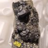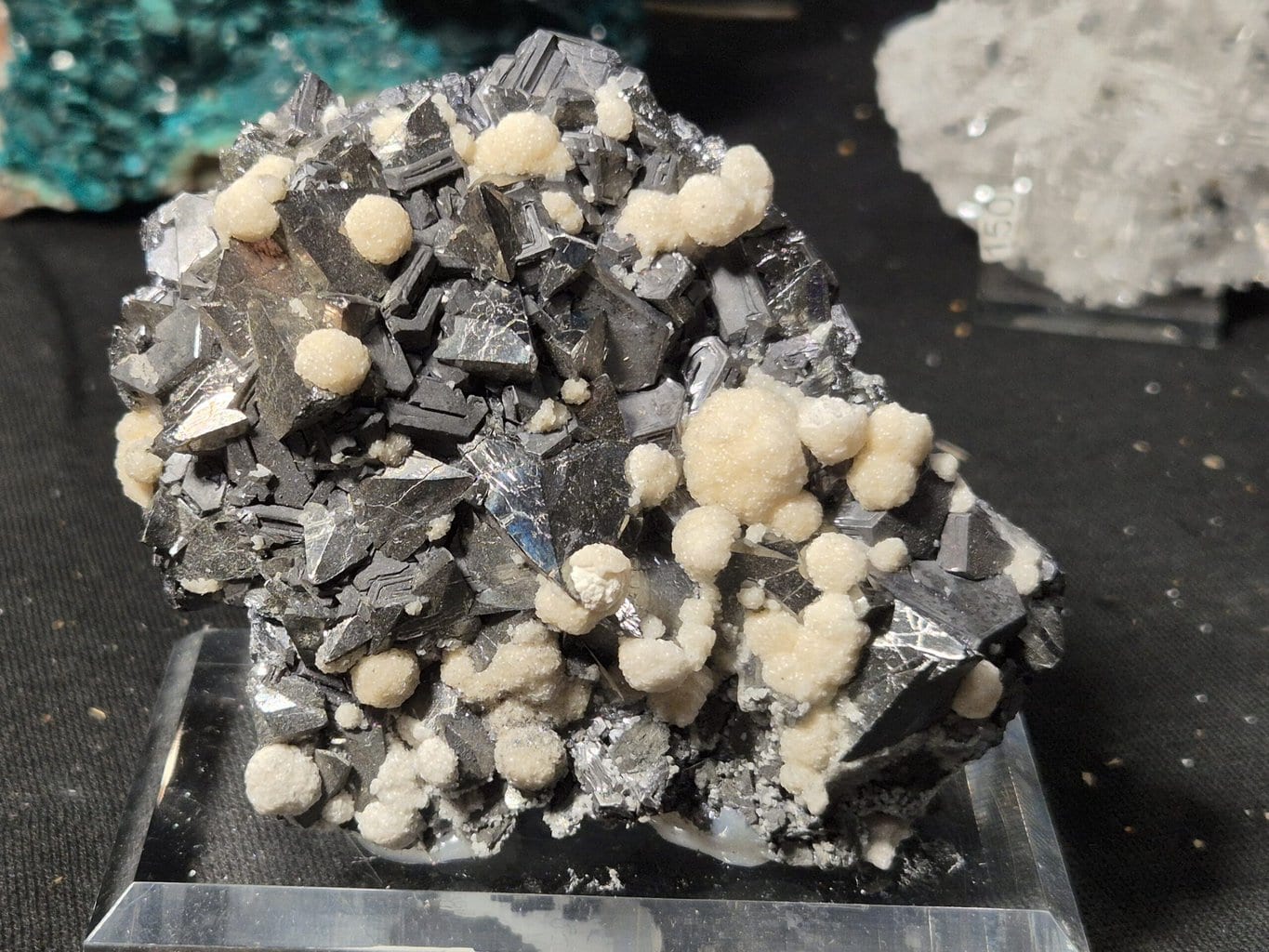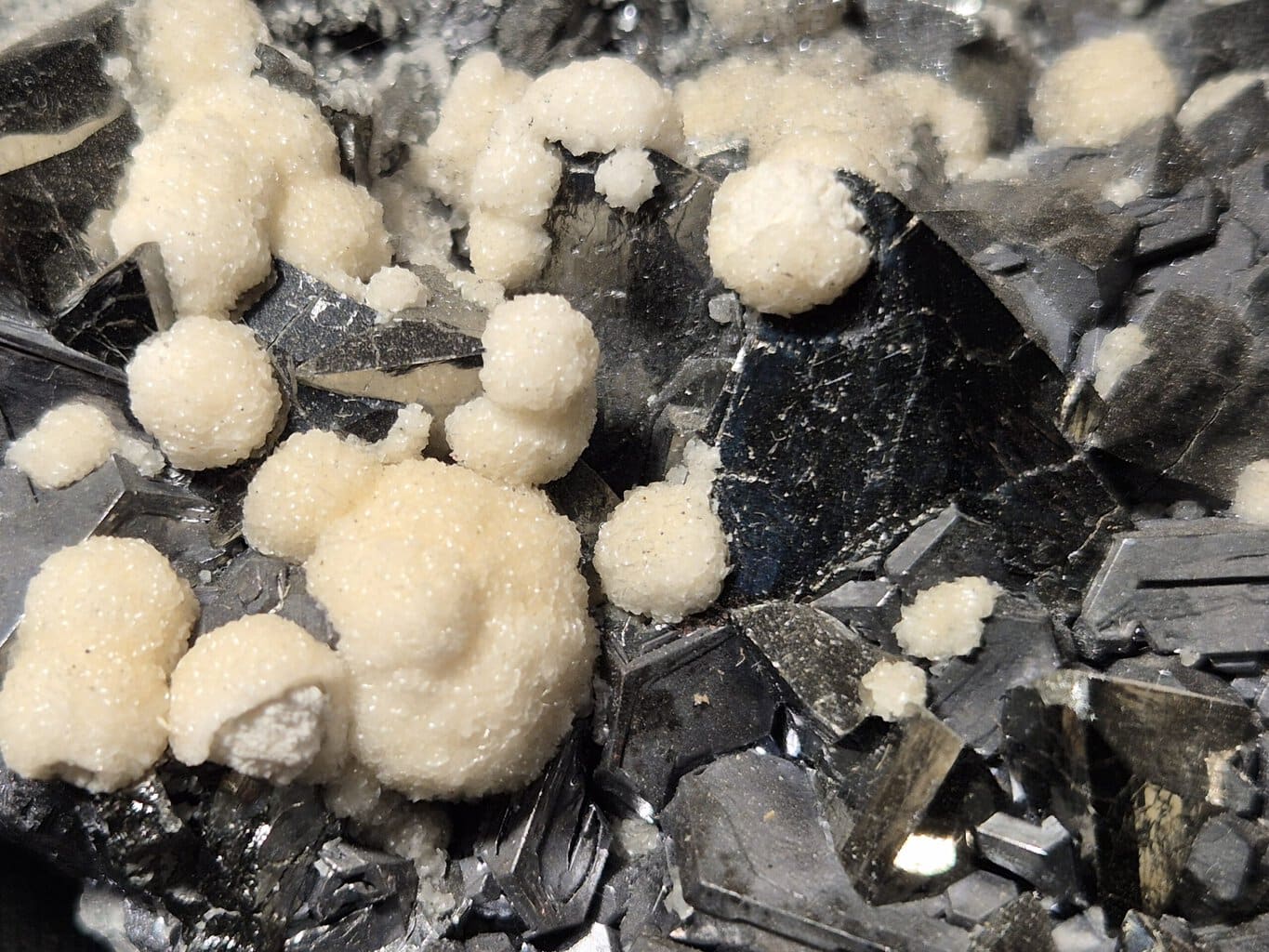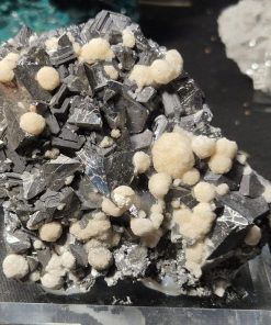 Tétraédrite Casapalca. Cristaux de cuivre gris, cristallisation tétraédrique avec rosettes de calcite blanches. mine aguas calientes , Casapalca, Pérou.